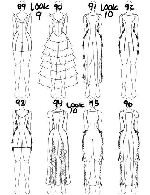 As part of my design development, I created over 100 exploratory sketches to visualize and refine the themes of my thesis. Through a process of review and iteration, I narrowed the concepts down to 10 focused looks that best represented the core of my narrative. From there, I selected the strongest 7 to develop into final designs.
