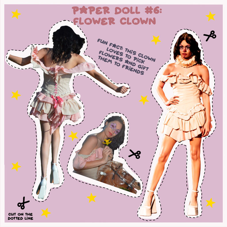 The Flower Clown look features an off-white linen bustier with off-the-shoulder ruffles in soft pink and off-white, finished with vintage lace along the hem. It’s paired with a yoke skirt laced underneath, revealing matching layered ruffles, and completed with an off-white ruff collar for a delicate, vintage touch.